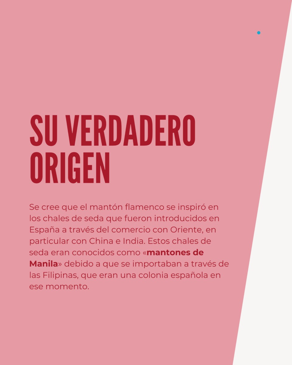 Se cree que el mantón flamenco se inspiró en los chales de seda que fueron introducidos en España a través del comercio con Oriente, en particular con China e India. Estos chales de seda eran conocidos como «mantones de Manila» debido a que se importaban a través de las Filipinas, que eran una colonia española en ese momento.