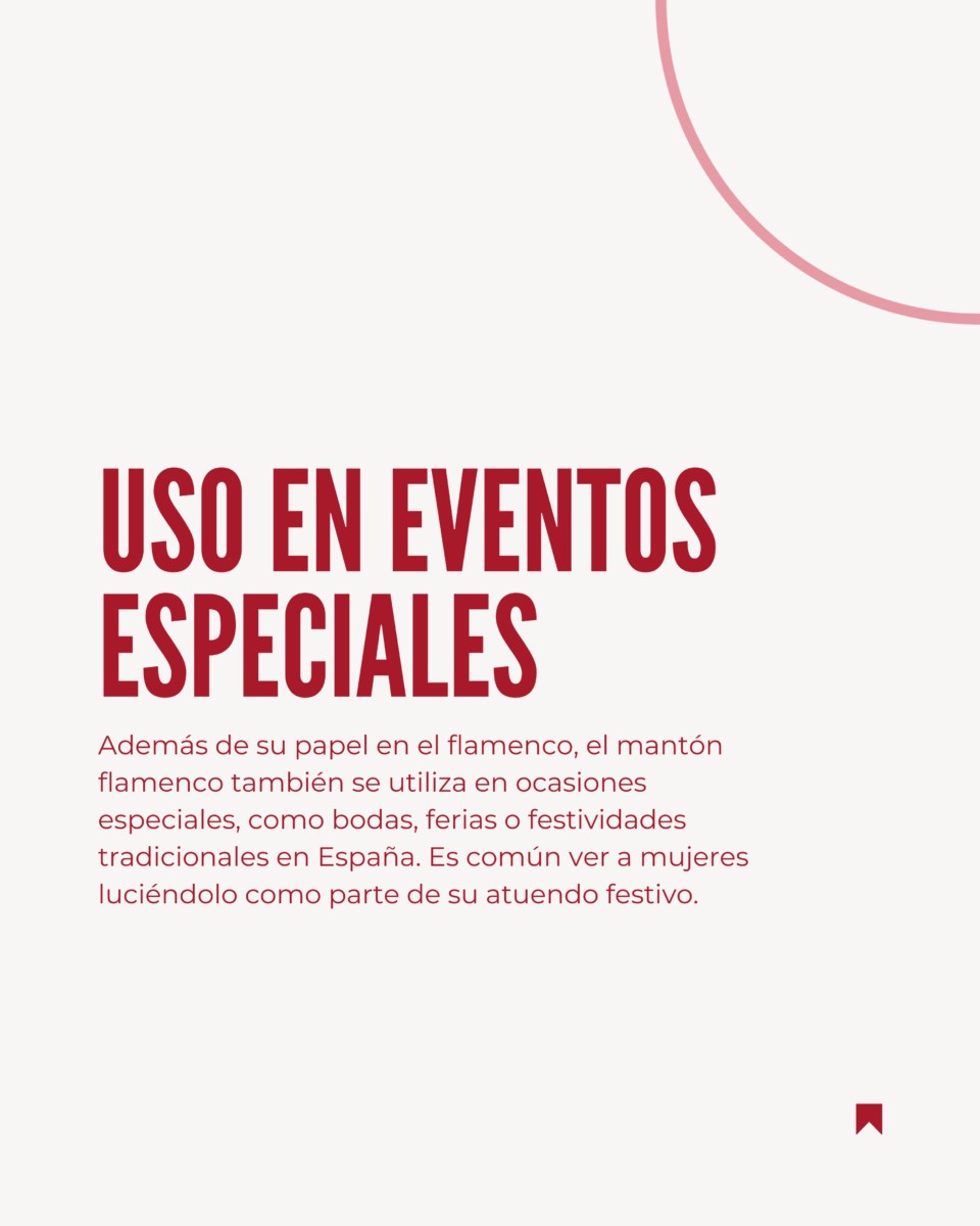 Además de su papel en el flamenco, el mantón flamenco también se utiliza en ocasiones especiales, como bodas, ferias o festividades tradicionales en España. Es común ver a mujeres luciéndolo como parte de su atuendo festivo.